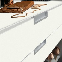 Con este vestidor a medida en U aprovecharás todo el espacio disponible. Posee las características del vestidor perfecto: zonas de ropero anchas con barras LED, elevadores de armario, pantaloneros y tablas deslizantes, zapateros deslizantes, cajones equipados y, además, dos zonas diferenciadas para los usuarios, delimitadas de forma elegante por dos colores distintos. Los muebles extraíbles pueden colocarse donde desee el usuario, para almacenar y apoyar objetos o para servir de asiento.