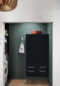 El juego de colores refrescante y atemporal (roble, negro, blanco y verde salvia) convierte a este amplio cuarto de baño familiar y actual en una estancia auténtica y moderna al mismo tiempo. El baño incluye una ducha, una bañera de hidromasaje y una zona de lavadero con armarios muy funcionales para que cada uno de los miembros de la familia ajuste el espacio de almacenamiento a sus necesidades.