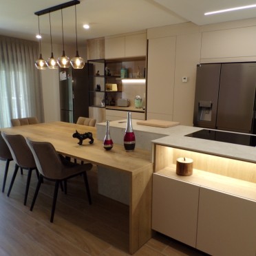 • Cocina con isla en tiza y roble natural